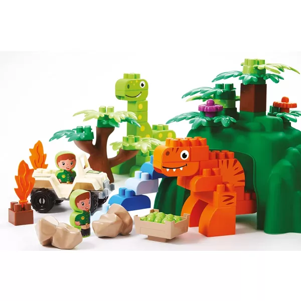 Ez a 87 darabos építőkocka csomag a dinoszauruszok világába kalauzolja el a gyerekeket. Az építőelemekből 3 darab dinoszaurusz figura, egy zöld barlang, fák és egyéb kiegészítő elemek építhetőek össze.