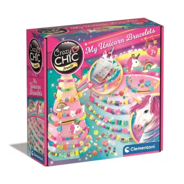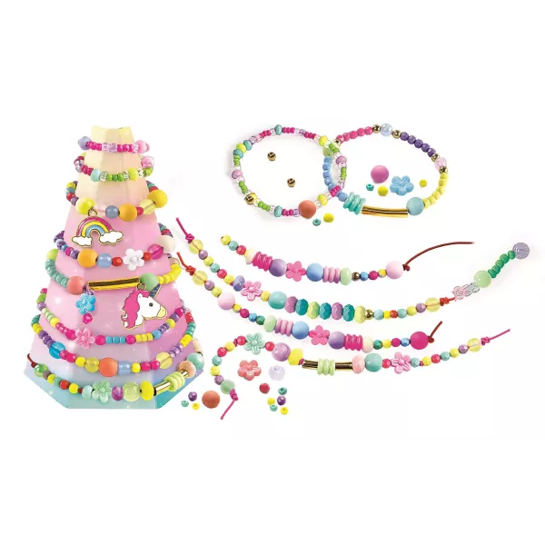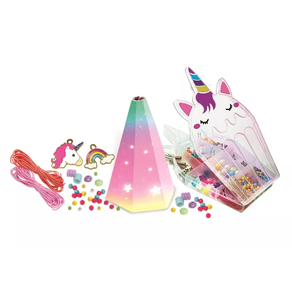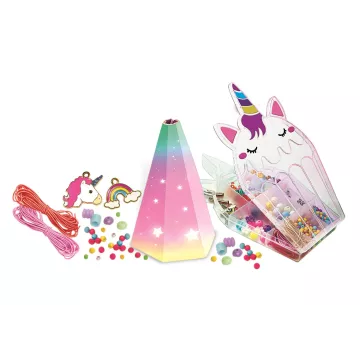 Kreatív készlet színes karkötők készítéséhez, unikornisos és szivárvány alakú függődíszekkel. A készlet többszínű és különböző formájú gyöngyöket, kis függődíszeket, mini pomponokat és színes gumiszalagokat tartalmaz. A játék fejleszti a kreativitást, képzelőerőt és kézügyességet.
