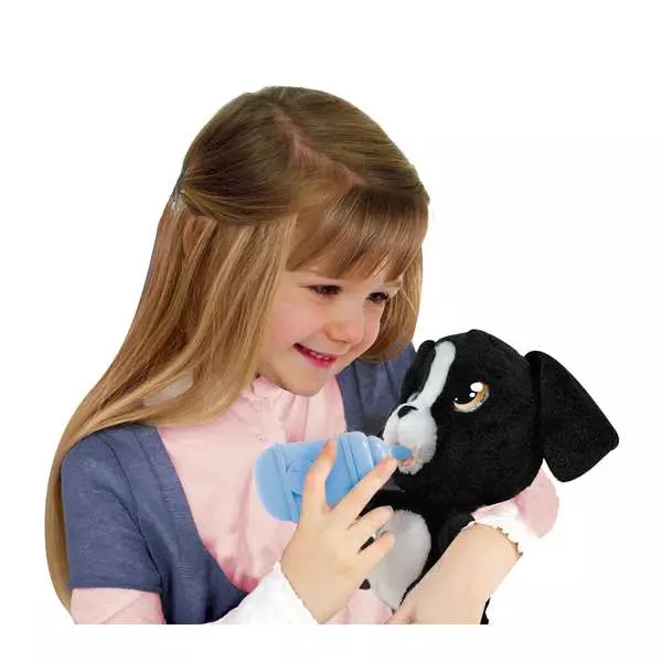 Miután a gyerekek megtöltötték vízzel a csomagban található cumisüveget, valóban megitathatják a kutyust. Ezt követően a kutya bal mancsát megnyomva a könnyek kicsordulnak a hatalmas, kifejező szemekből.
