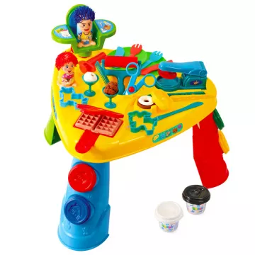 Tartalom: 6 tégely különböző színű gyurma a fedelükön különböző formákkal, gyurmakés, gyurmaolló, formakinyomó, gofri formanyomó, nyújtóhenger, gyurmaprés, 2 állatos gyurmaforma, mókás fodrász szék két figurával, kétrészes fánkforma, munkaasztalka 3 lábbal, műanyag kiegészítők (tányérok, kések, villák, poharak, fésű)