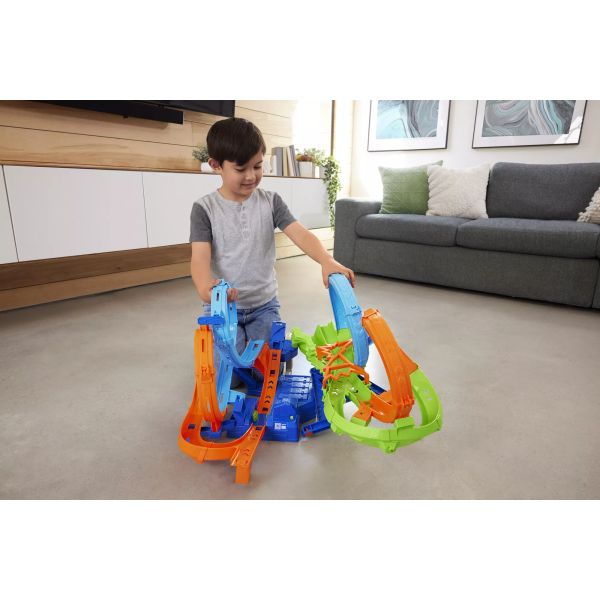 A gyerekek ezzel a készlettel mindet megtapasztalhatják. A kisautók négy fantasztikus hurkon és egy háromirányú ütközési zónán keresztül őrült akcióba hajtanak minden újabb körrel. A motorizált kilövő állandó mozgásban tartja az autókat, nagyobb izgalmak és még nagyobb kihívások érdekében. Vajon hány autó tud egyszerre versenyezni, mielőtt az elkerülhetetlen ütközés bekövetkezik? A készlet összecsukva egyszerűen tárolható, a motorizált kilövőn öt 1:64-es méretarányú játékautó parkolhat.