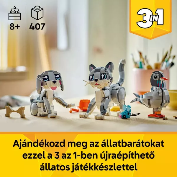 • 3 gyerekeknek szóló, kisállatos építési lehetőség 1 dobozban – A LEGO® Creator 3 az 1-ben Játékos cica építőszettel a 8 éves vagy nagyobb lányok és fiúk 3 különböző, állatos játékkészletet építhetnek meg, és építhetnek át ugyanazokból a kockákból
