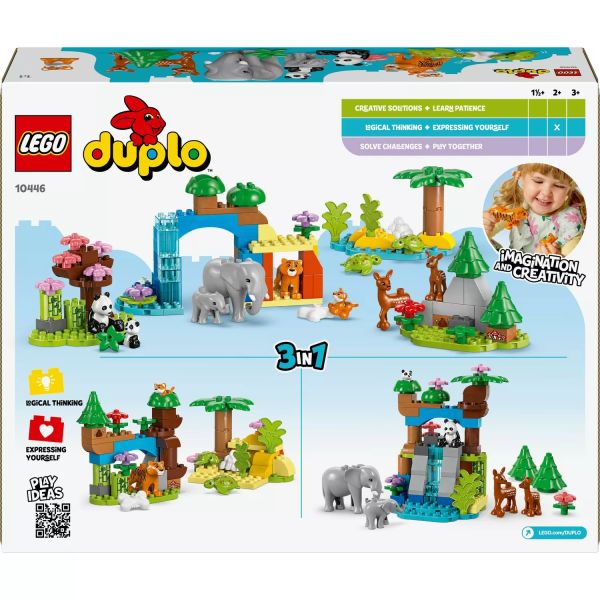 Keres egy ajándékot, amely fejleszti a finommotoros készségeket, a képzelőerőt és egyben a törődésre is tanít? A LEGO® DUPLO® 3 az 1-ben Állatcsaládok a Vadvilágban (10446) szett tökéletes választás! Ez a 92 darabos, természet ihlette játék szett egyenesen az állatok lenyűgöző világába repíti az óvodáskorú gyermekeket. A dobozban 10 elbűvölő LEGO DUPLO állatfigura rejtőzik – köztük tigris, elefánt, szarvas, panda és teknős –, amelyekkel a kicsik azonnal elmerülhetnek a szerepjátékban és a gondoskodás élményében.
