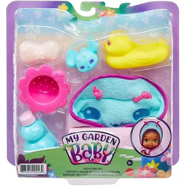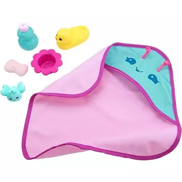 A My Garden Baby Édi-Bédi kiegészítő szettjeivel a kislányok eljátszhatják a napi rutinhoz tartozó pillanatokat. A fürdetés készletben mindent megtalálnak, amire szükség lehet az esti pancsihoz: katicabogaras fürdő poncsó, szappan, tusfürdő, dugó és persze az elmaradhatatlan gumikacsa.
