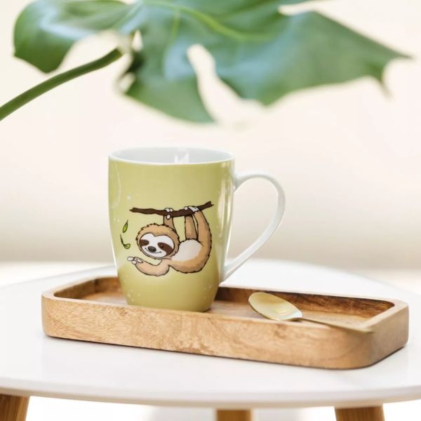Hát ki ne szeretné egy lajhár mintás bögréből szürcsölni a reggeli kakaót vagy teát? A bögrét kívül egy aranyos lajhár díszíti, egyik felén ahogy a fáról lóg, a bögre másik felén pedig leveleket eszik. A dekoratív bögre akár a polc ékévé is válhat.