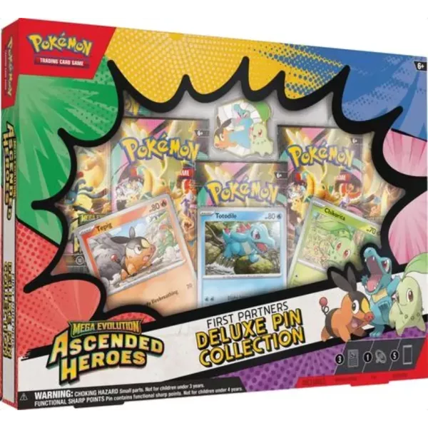 Válaszd ki az első társad, és kezdd el új fejezetét a Pokémon Kártyajáték kalandodnak a Pokémon TCG: ME02.5 Ascended Heroes - First Partners Deluxe Pin Collection szettel A különleges gyűjtődoboz a Chikorita, Tepig és Totodile rajongóinak készült. Három ikonikus első partner Pokémon jelenik meg benne fényes foil promó kártyaként, egységes dizájnnal, gyűjtők és játékosok számára is vonzó kivitelben. A kártyák standard méretűek, teljesen kompatibilisek minden Pokémon TCG paklival és kártyavédővel. A doboz középpontjában egy exkluzív, magas minőségű zománc kitűző áll, amelyen Chikorita, Tepig és Totodile együtt látható. A kitűző fém alapra égetett színes zománcból készül, fényes lakkozott felülettel. Táskán, sapkán, lanyardon vagy gyűjtőfalon is jól mutat, biztonságos fém rögzítővel. A készlet öt darab Pokémon TCG: MEGA Evolution – Ascended Heroes erősítő csomagot tartalmaz. Ez az angol nyelvű kiegészítő az egyik legnagyobb és legizgalmasabb Pokémon TCG szett, számos Mega Evolution lappal, különleges Special Illustration Rare és Gold kártyákkal. A booster csomagok véletlenszerű lapkiosztást tartalmaznak, így minden doboz egyedi bontási élményt nyújt. Különleges vadászat indulhat olyan lapokra, mint például a Mega Gengar ex vagy a Mega Charizard Y ex (spekulatív gyűjtői célpontokként említve). Az Ascended Heroes szettben új típusú, látványos Mega Attack Rare kártyák is találhatók, jellegzetes, japán katakana feliratokkal és pop-art stílusú grafikával. Ezek különösen keresettek a gyűjtők körében. A készlet kiváló belépő azoknak, akik most ismerkednek a Mega Evolution témájával, de elég tartalmas ahhoz is, hogy tapasztalt játékosok új lapokat szerezzenek paklijaik erősítésére. A doboz tartalmaz egy kód kártyát a Pokémon TCG Live online játékhoz. A kód beváltásával digitális tartalom nyílik meg, így a fizikai gyűjtemény mellett online pakli is építhető. Ez segít összekötni az asztali játékot a digitális élménnyel, és lehetőséget ad gyakorlásra, paklitesztelésre. A csomagolás színes, képregényes stílusú grafikát kapott, jól láthatóan jelölve a fő tartalmakat: 3 promó kártya, 1 kitűző, 5 booster és az online kód. A doboz kialakítása átlátszó ablakos, így a promó lapok és a kitűző azonnal megtekinthetők – ajándékként is látványos, kirakatban és polcon is mutatós. A termék angol nyelvű kártyákat tartalmaz, és ideális gyűjtőknek, Pokémon-rajongóknak és TCG játékosoknak, akik szeretnék feldobni gyűjteményüket egy tematikus, első partner Pokémonokra épülő szettel. A gyártó jelölése szerint a készlet 6 éves kortól ajánlott, mivel kisebb alkatrészeket (pin, kártyák, fóliák) tartalmaz. A termék jellemzői: