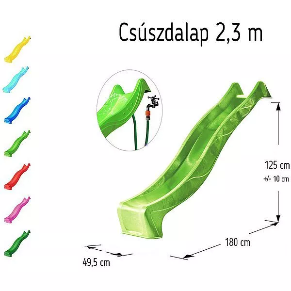 Ezt a almazöld színű csúszdalap modellt akár vizes csúszdává is alakíthatják a boldog tulajdonosok egy slag segítségével. Ajánljuk kerti medencék, pancsolók kiegészítéséhez.