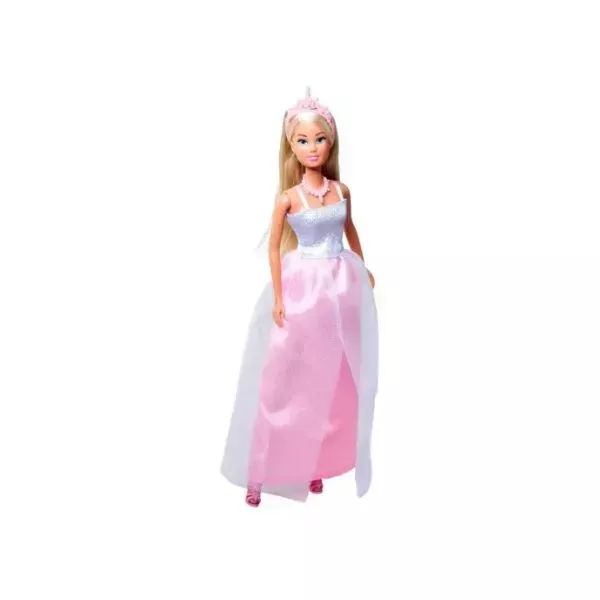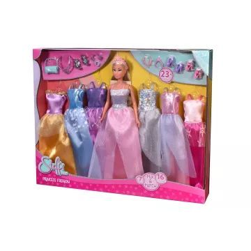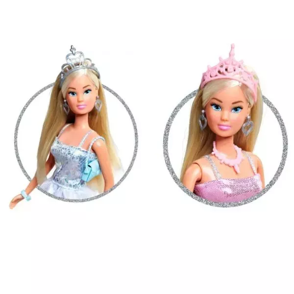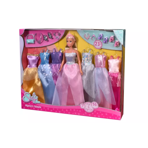 A készletben egy elegáns Steffi Love baba található, hosszú szőke hajjal és csillogó hercegnőruhában. A baba több ponton mozgatható, így könnyen felültethető, pózolható, táncoltatható. A dobozban 7 különböző hercegnő ruha kapott helyet, különböző színekben és fazonokban, így mindig más stílusban jelenhet meg Steffi. A ruhák között csillogó, szatén fényű és tüllszoknyás darabok is vannak, amelyek kifejezetten a mesés bálok és ünnepi alkalmak hangulatát idézik.