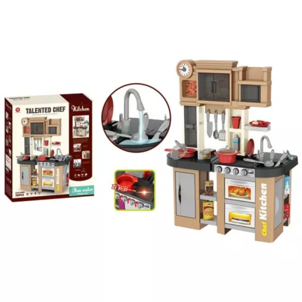 Minden apró séf álma egy jól felszerelt konyha. Szerencsére a Szuperséf konyhában minden megtalálható, ami csak szükséges a játékételek elkészítéséhez. Vigyázat! Könnyen mesterszakács válhat a gyerekekből, ha ezzel a 56 darabos szettel ismerik meg az ételkészítés rejtelmeit! Ráadásul a részletgazdag és szépen kidolgozott konyha hangeffektekkel és fényekkel teszi még szórakoztatóbbá a játékot. És hogy mi jön a főzés után? A mosogatás... A gyerekek már egészen kis korban megtanulhatják, hogy rendet is kell tenni. A csaphoz tartozó tartályba víz tölthető, majd az edények folyó víz alatt elmoshatók.