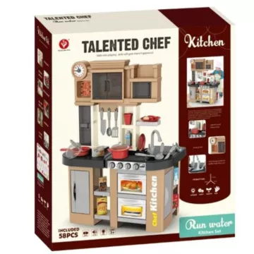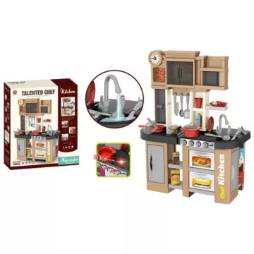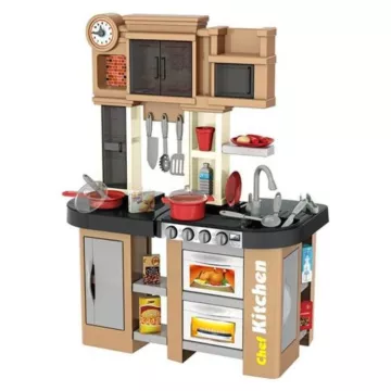 A szettben számos konyhai eszköz és játék étel is található, hogy mindenki elkészíthesse kedvencét. A sütő, a hűtőszekrény és a szekrények ajtaja nyitható, gombok tekerhetők, a főzőlap pedig világít és hangot ad.